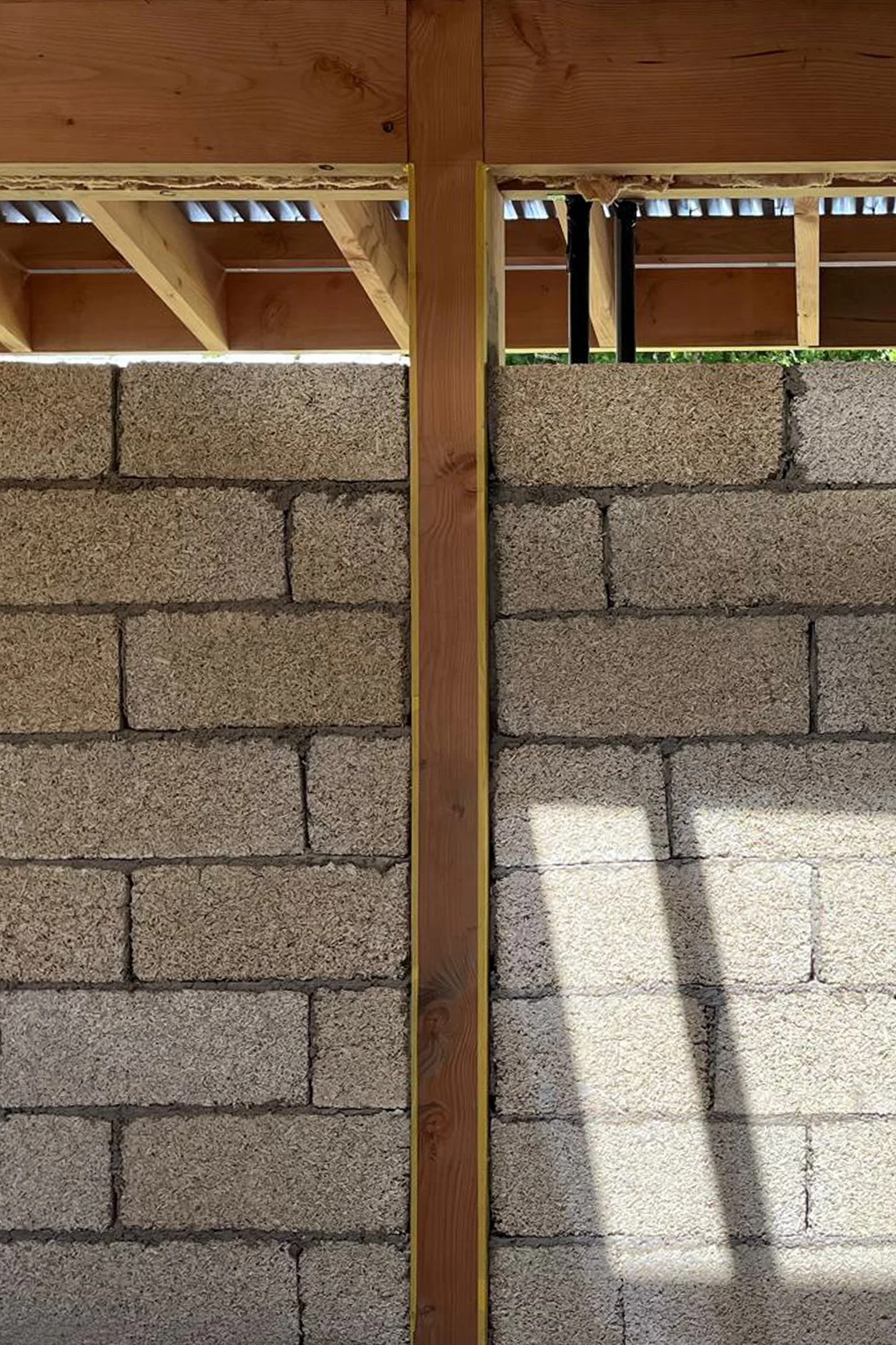 The blocks will be finished with a thin coat of lime plaster inside, between the posts, and a thick coat of lime harling outside.